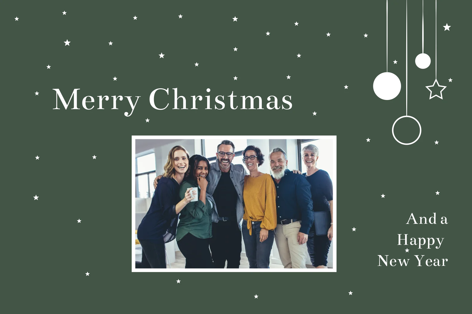 Een donkergroene kaart met een vervangbare foto op de voorkant, omringd door kerstversiering en sprankelende sterretjes.
