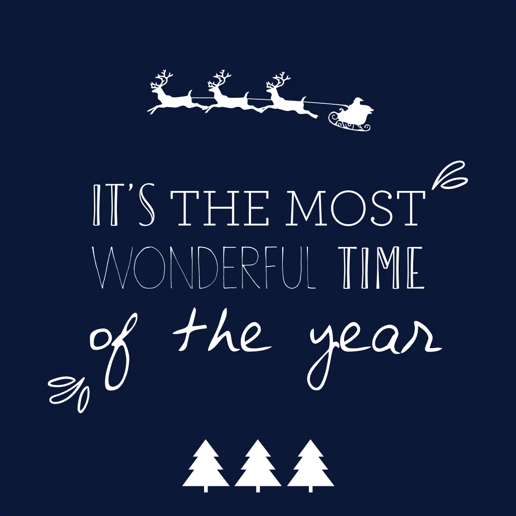 Een kaart met een donkerblauwe achtergrond waarop de Kerstman in een slee, bomen en de tekst 'It's the most wonderful time of the year' staan. Deze zijn gekleurd met goudfolie.