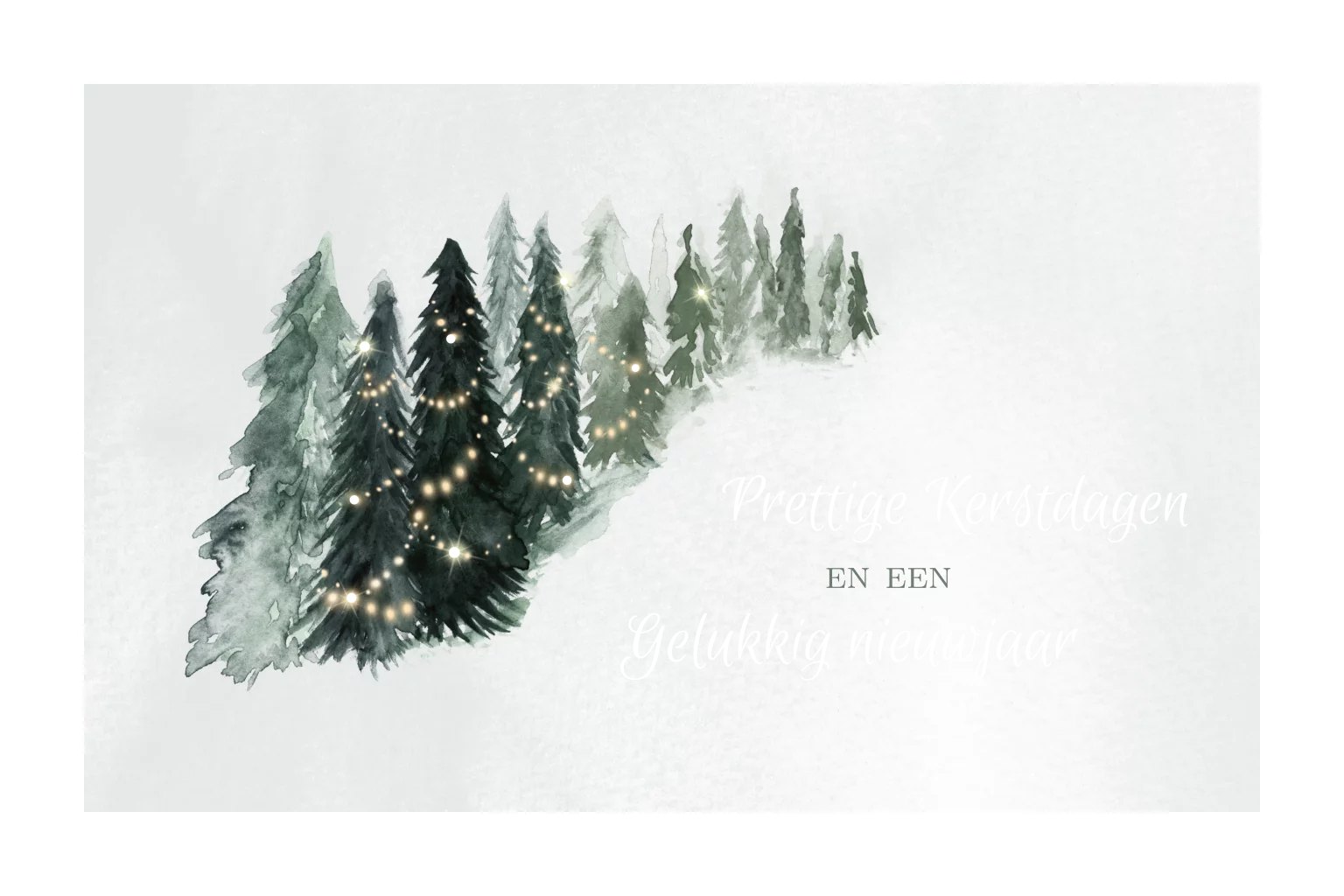 Een stijlvolle kerstkaart met kerstboompjes. Op de voorkant en achterkant wordt folie gedrukt. Leuk detail: in de kerstboompjes zitten lichtpuntjes met goudfolie.