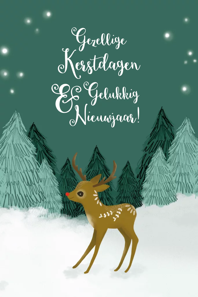Lieve kerstkaart met illustratie van hertje in winterlandschap