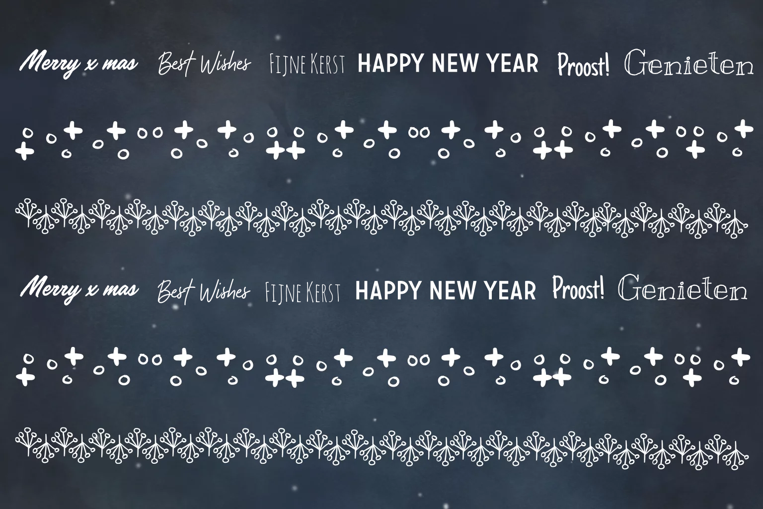 Een kaart met een donkere achtergrond waarop een patroon te zien is van kerstwensen, getekende takjes, plusjes en minnetjes.