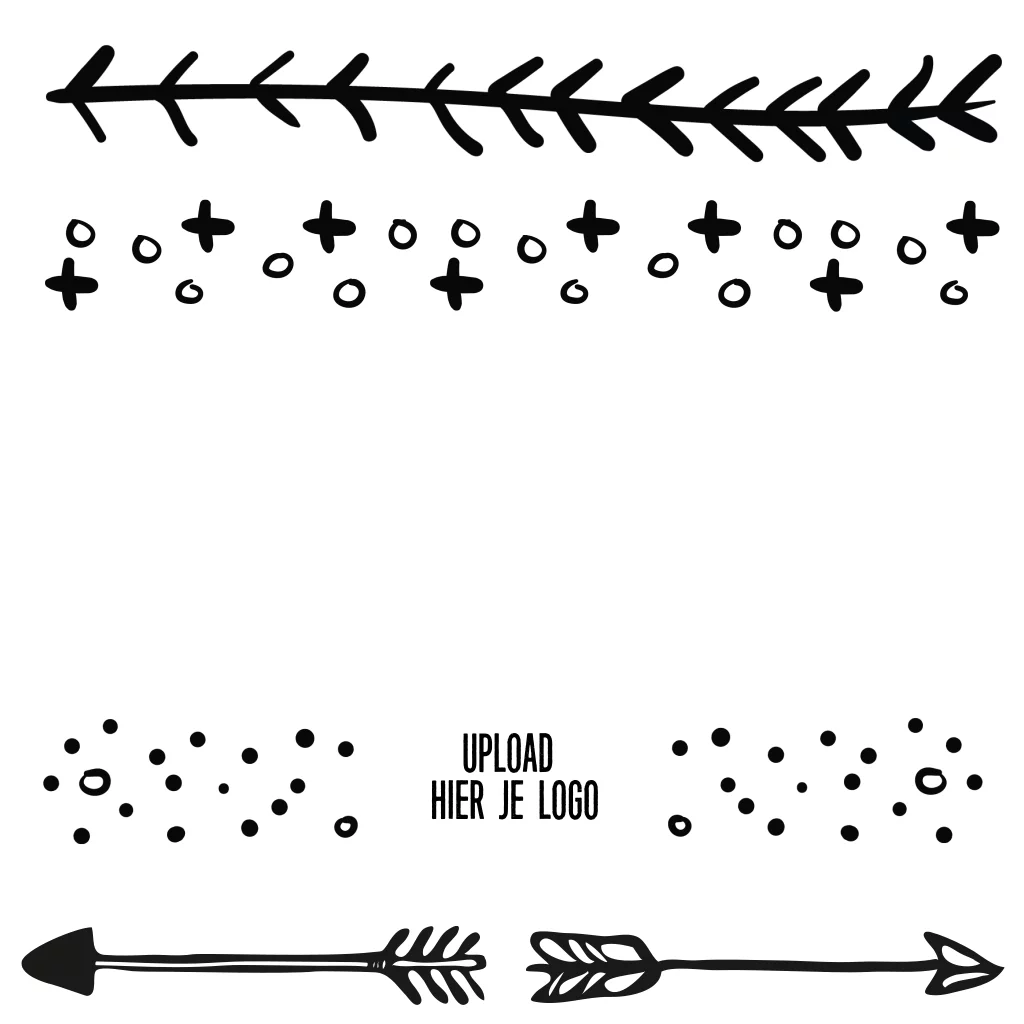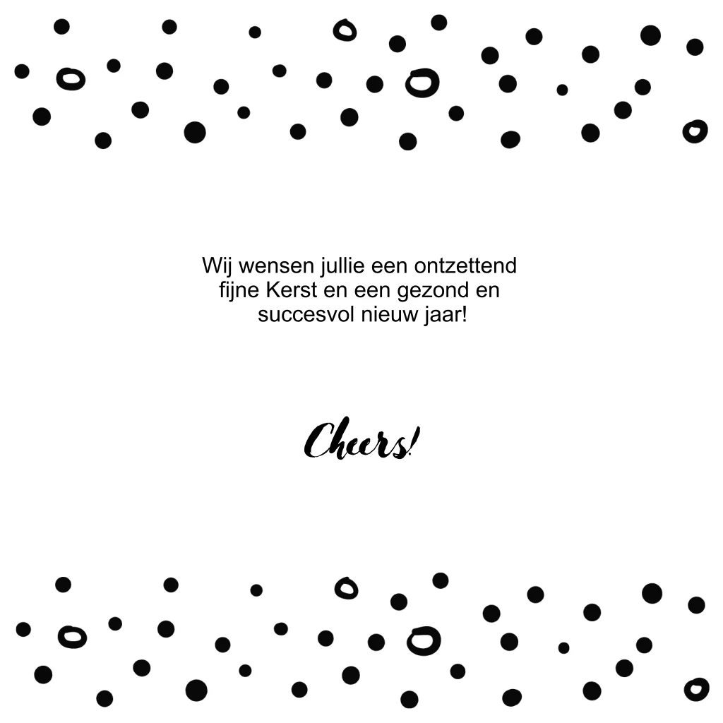 Een zwart witte kaart met lijnen en patronen van o.a. rondjes, met daarnaast de teksten 'hapjes & drankjes' en 'Fijne Kerst' gekleurd met zwarte folie.