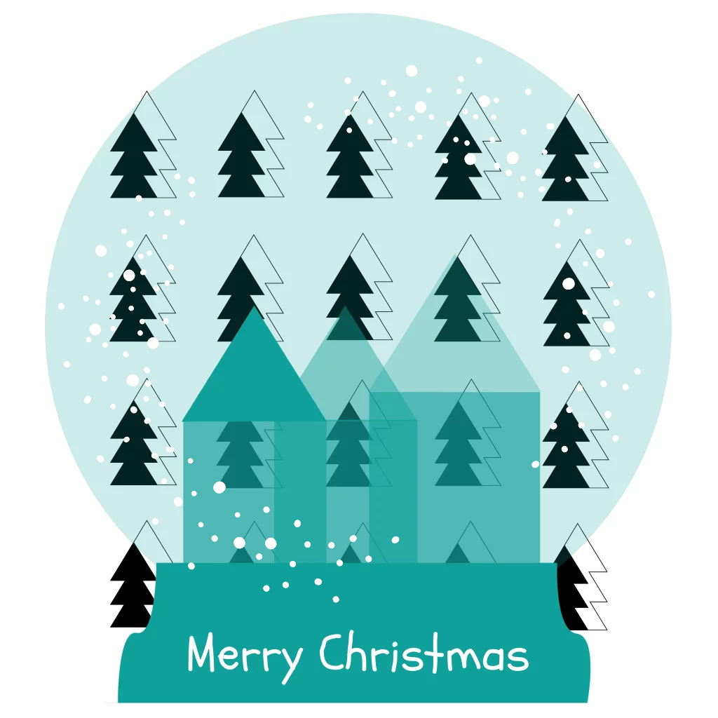 Een witte kaart met een zwart en wit kerstbomenpatroon. Daar boven op staat een blauwe sneeuwbol.