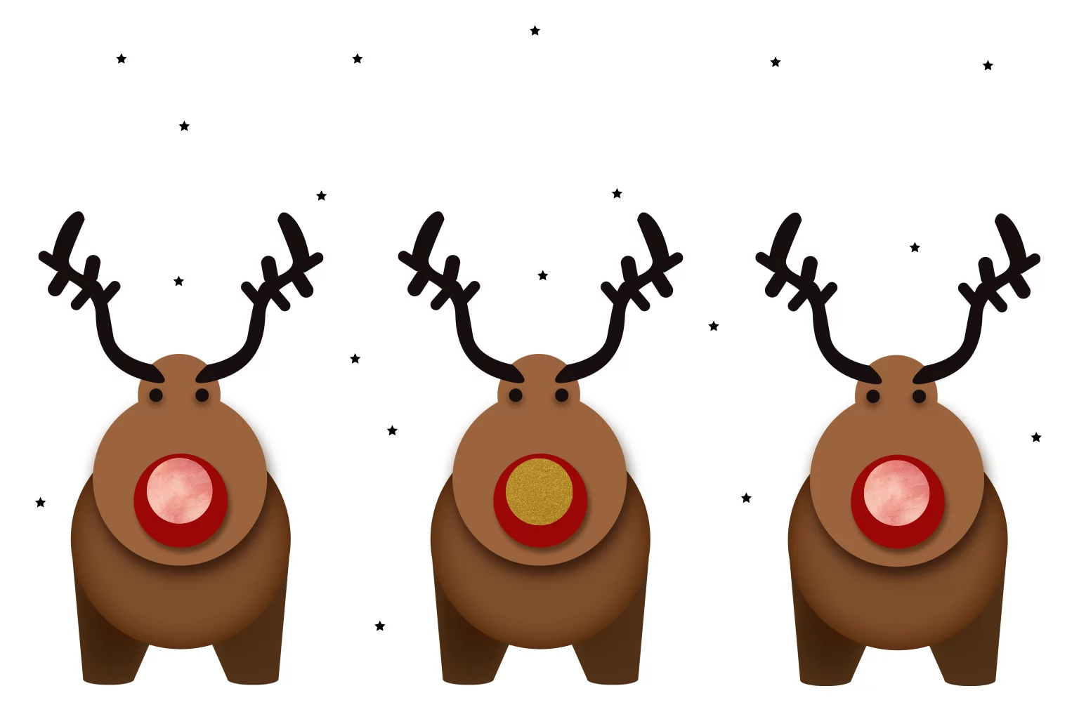 Een witte kaart met op de voorkant drie rendieren op een rij. Daarboven staat de tekst 'Merry Christmas'.