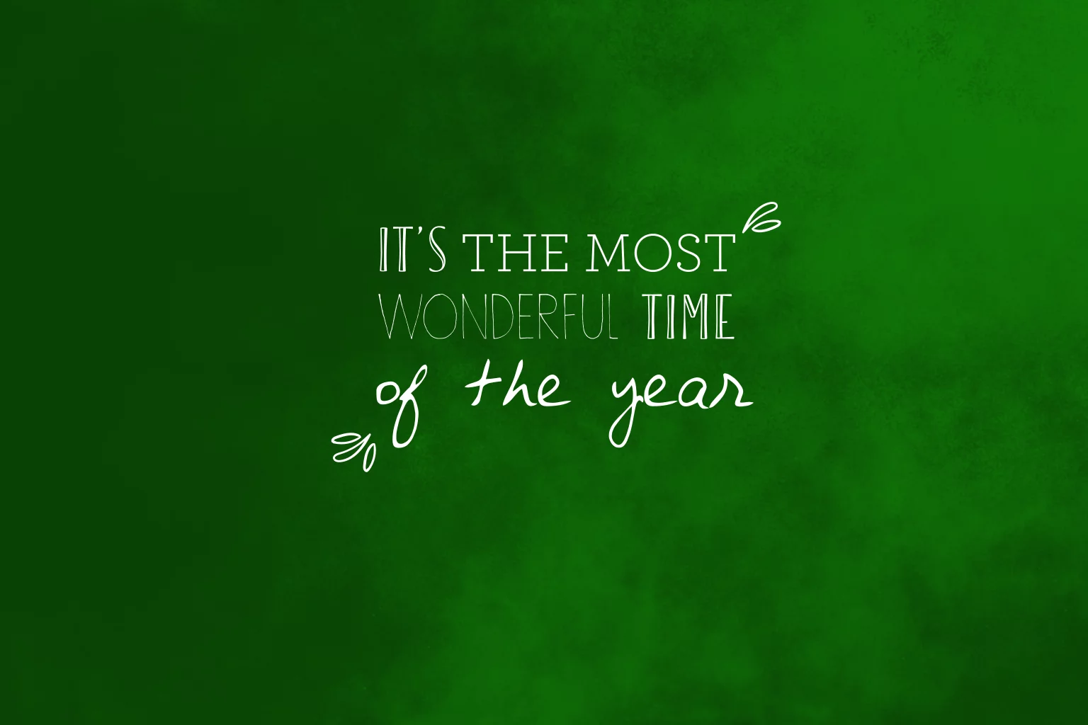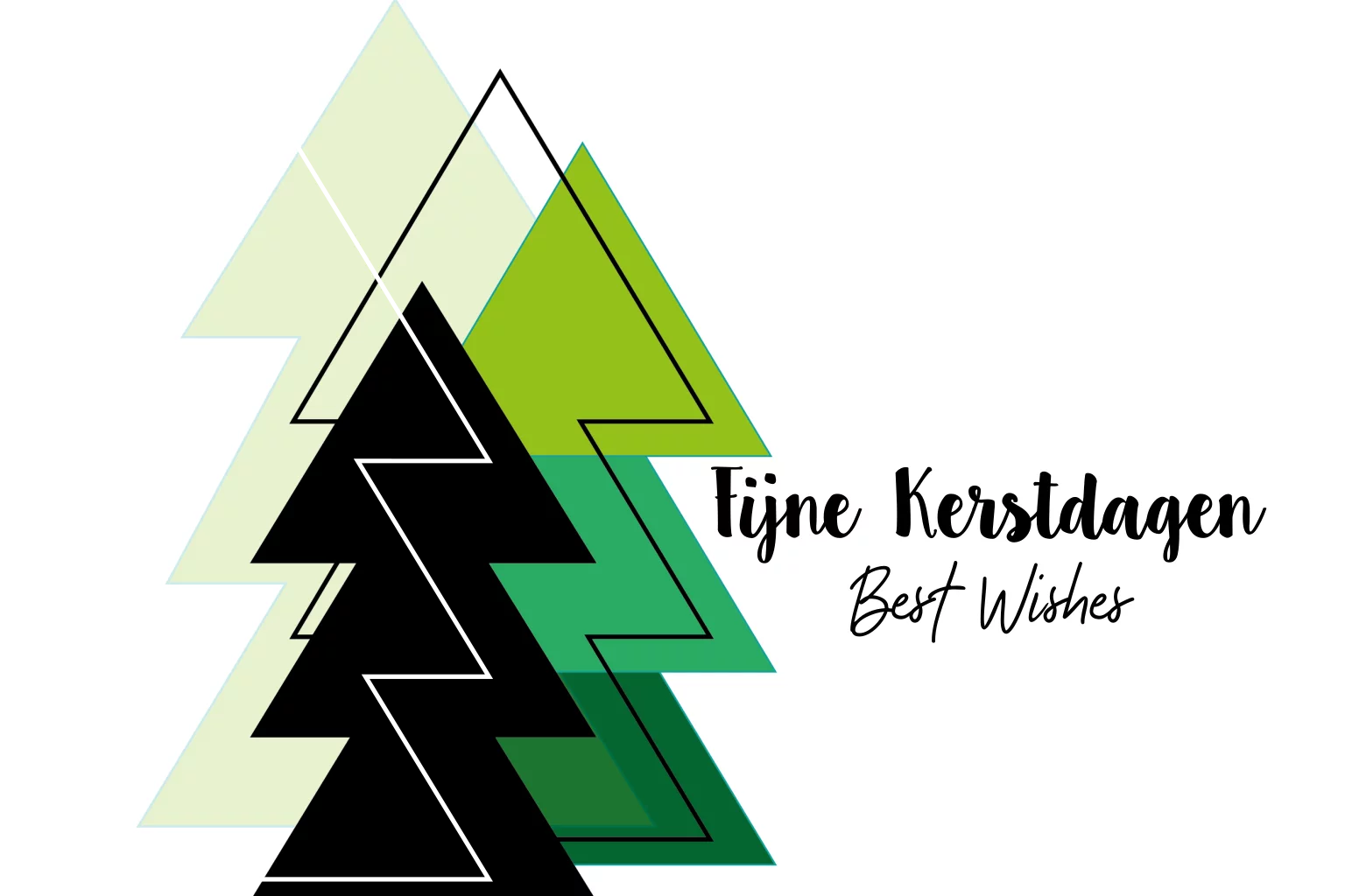 Kerstbomen met verschillende grafische stijlen vullen merendeels deze kaart. Ook bevat deze kaart nog wat stipjes en een volle groene achtergrond aan de binnenkant.