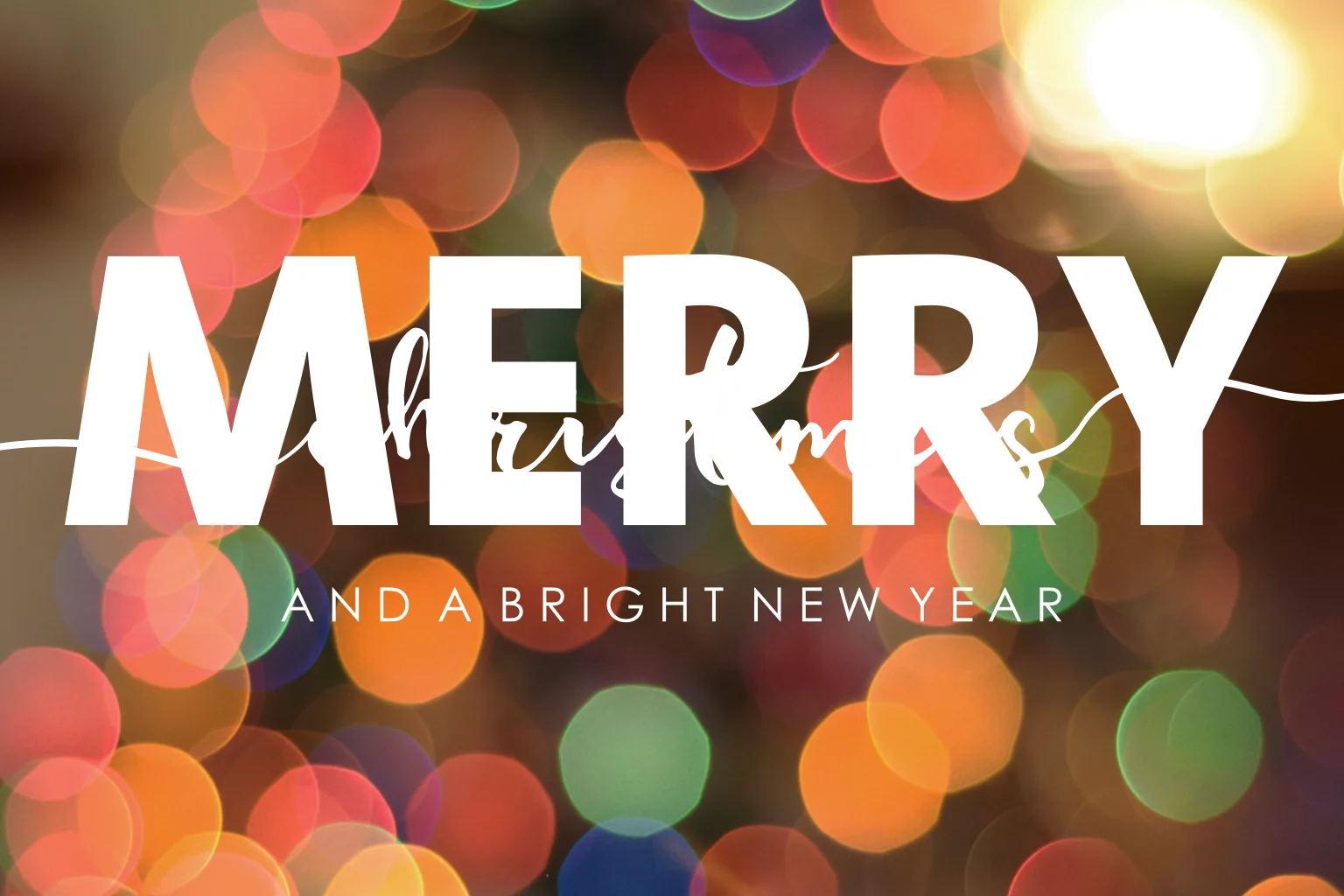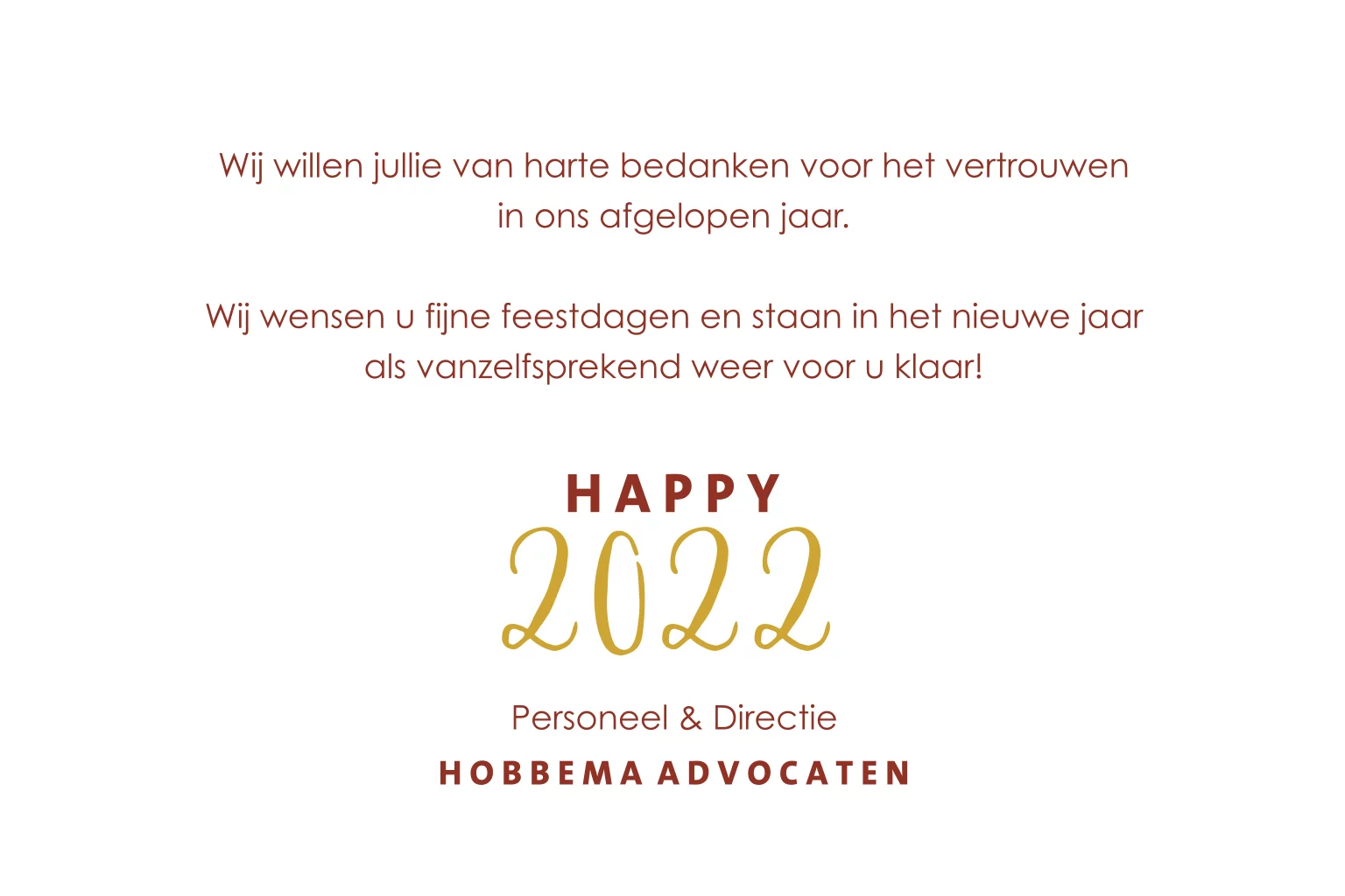 Vrolijke kerstkaart met foto van kerstlampjes en tekst in goudfolie. Ook te bestellen met een bedrijfsfoto.