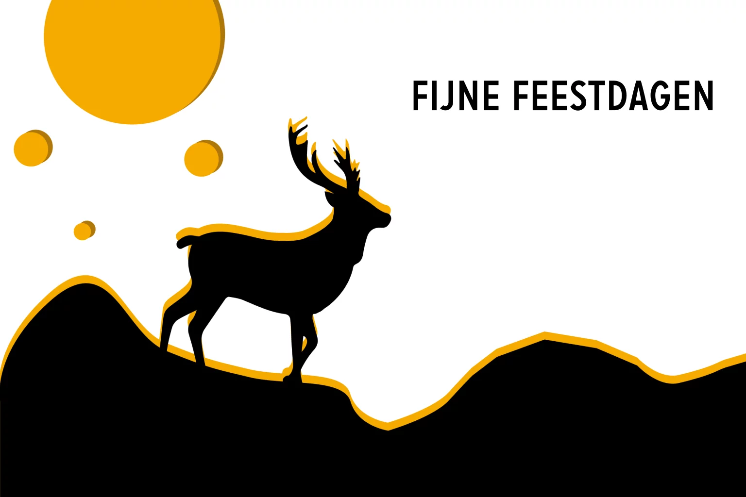 Een witte kaart met op de voorkant een rendier op een horizon. De kleuren geel en zwart staan centraal.