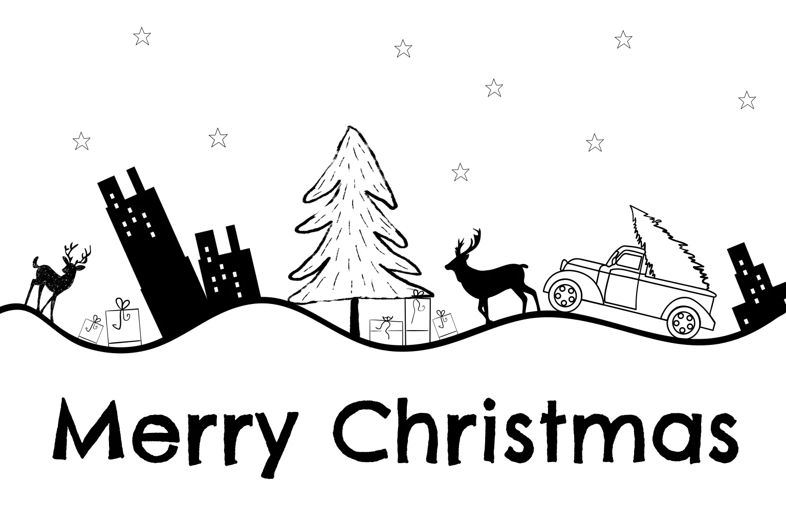 Een witte kaart met op de voorkant een kronkelende lijn waarop verschillende kerstelementen staan.