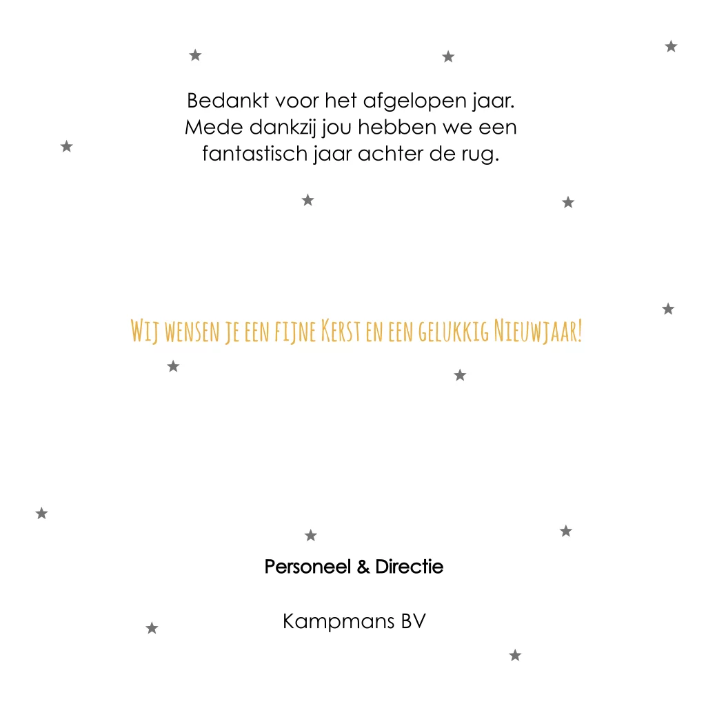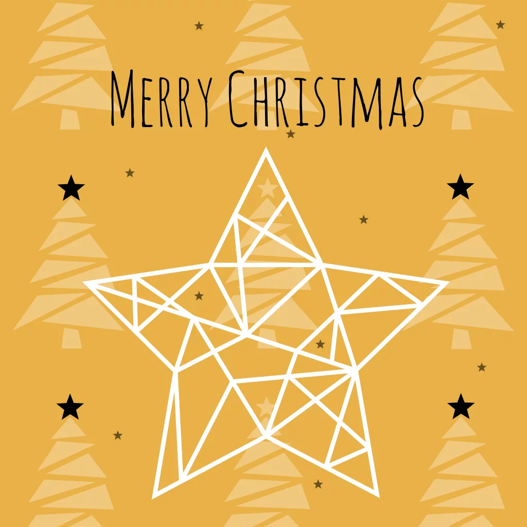 Een okergele kaart met op de voorkant een patroon van kerstbomen. In het midden staat een grote ster.