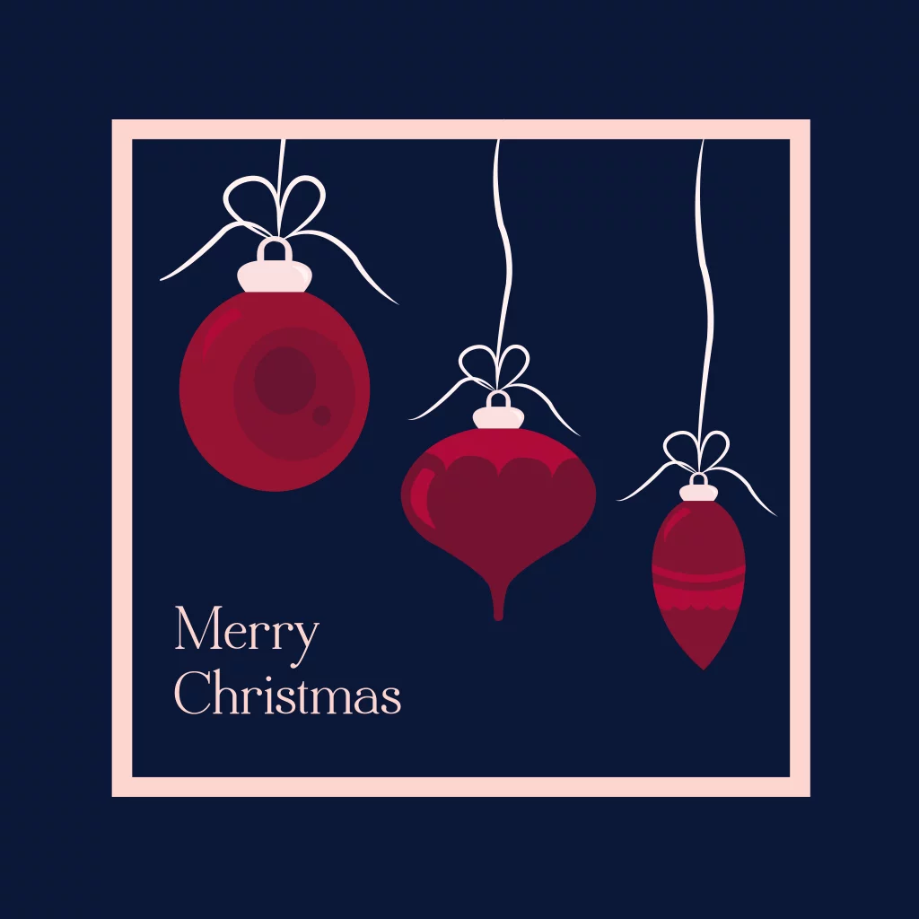Een groene kaart met drie kerstballen in een vierkant kader.