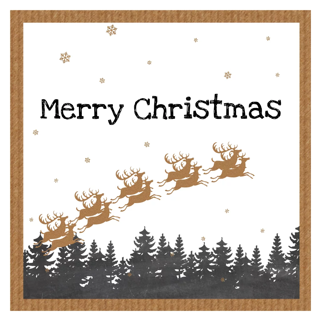 Een kaart met een kader, rendieren en sneeuwvlokjes met een kraft papier structuur.