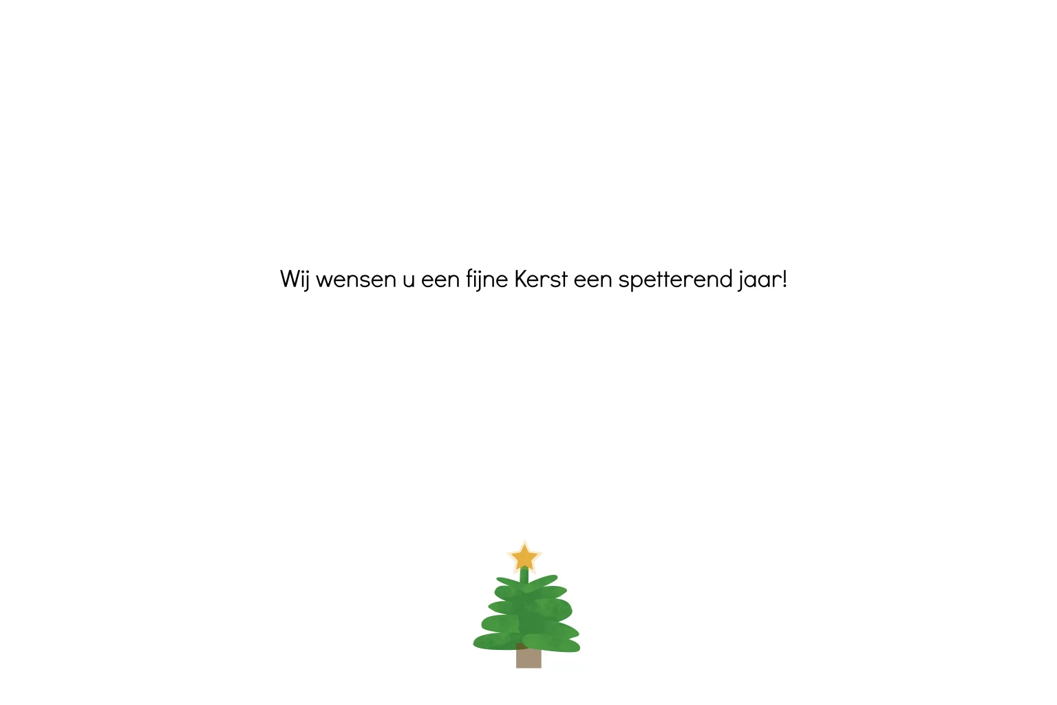 Een witte kaart met een zwart stippen patroon, een gele stip en kerstboompjes.