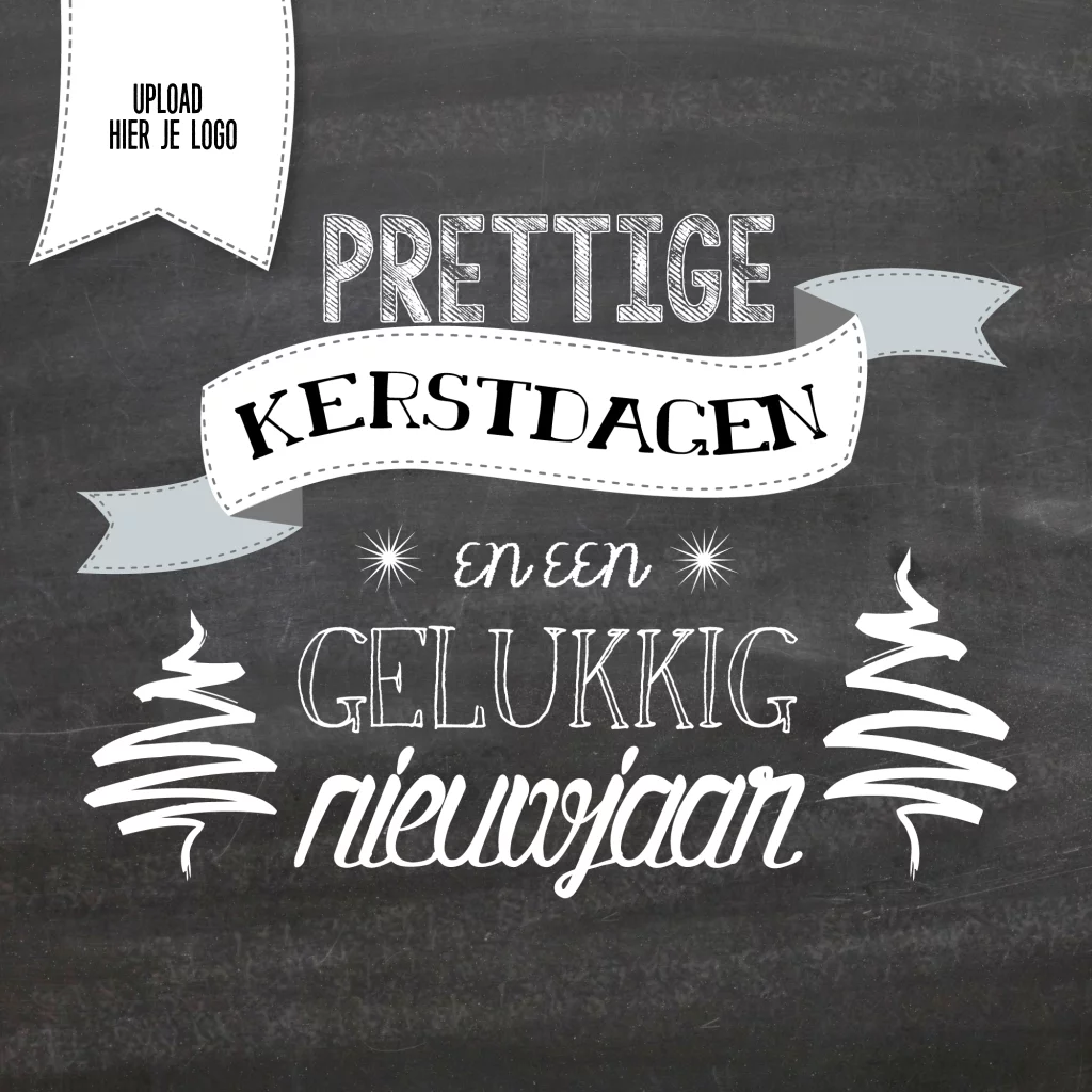 Stoere kerstkaart met witte vaandels, kerstbomen en lettertypes op een krijtbord achtergrond. Deze kaart gaaf i.c.m. een felle kleur envelop zoals rood!