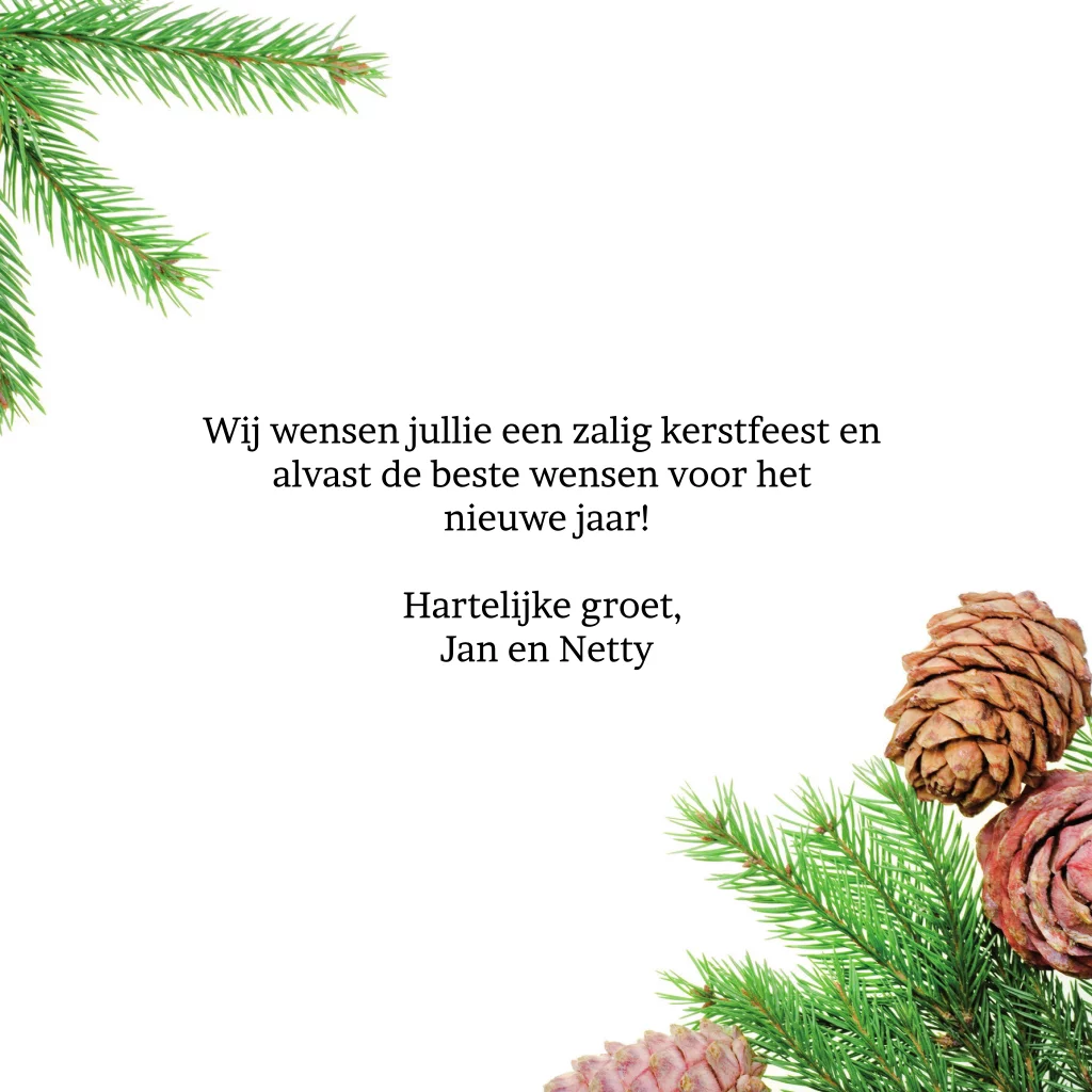Deze kerstkaart is echt kerst! Origineel is het rendiergewei op de tekst 'merry Christmas'. De achtergrond met groene dennentakjes wordt gecombineerd met dennenappels aan de binnenkant. Ook tof is dat de binnenkant is versierd met sterretjes en dat je hier een eigen foto toe kunt voegen!