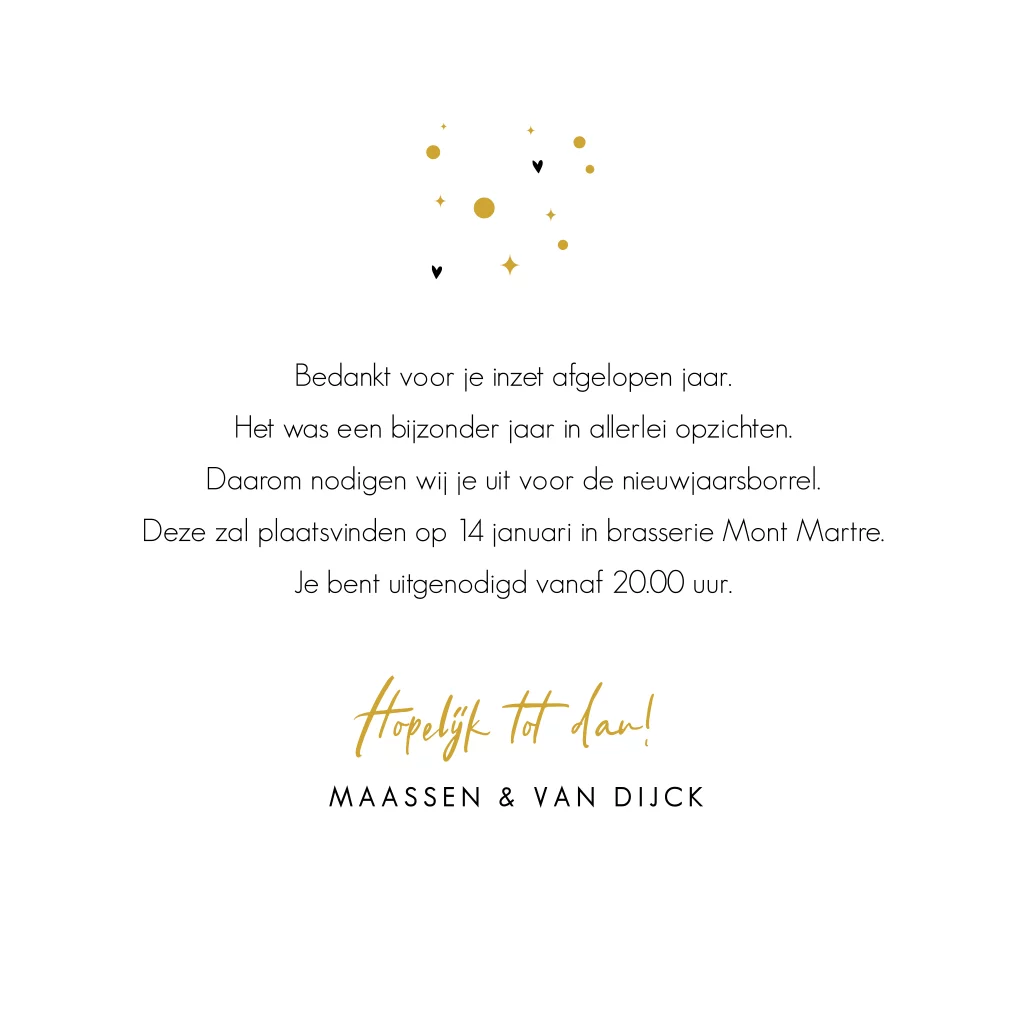 Nieuwjaarsborrel uitnodiging met goudfolie.