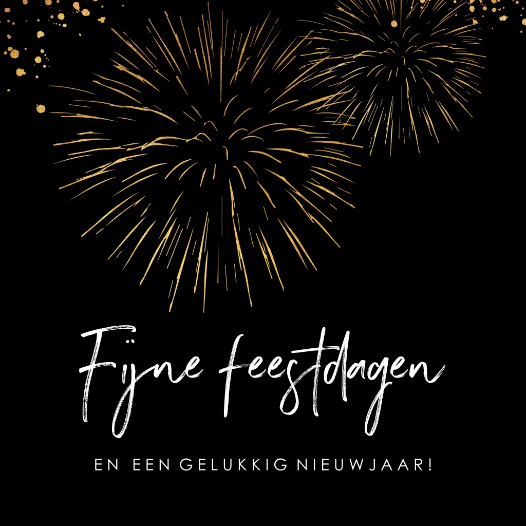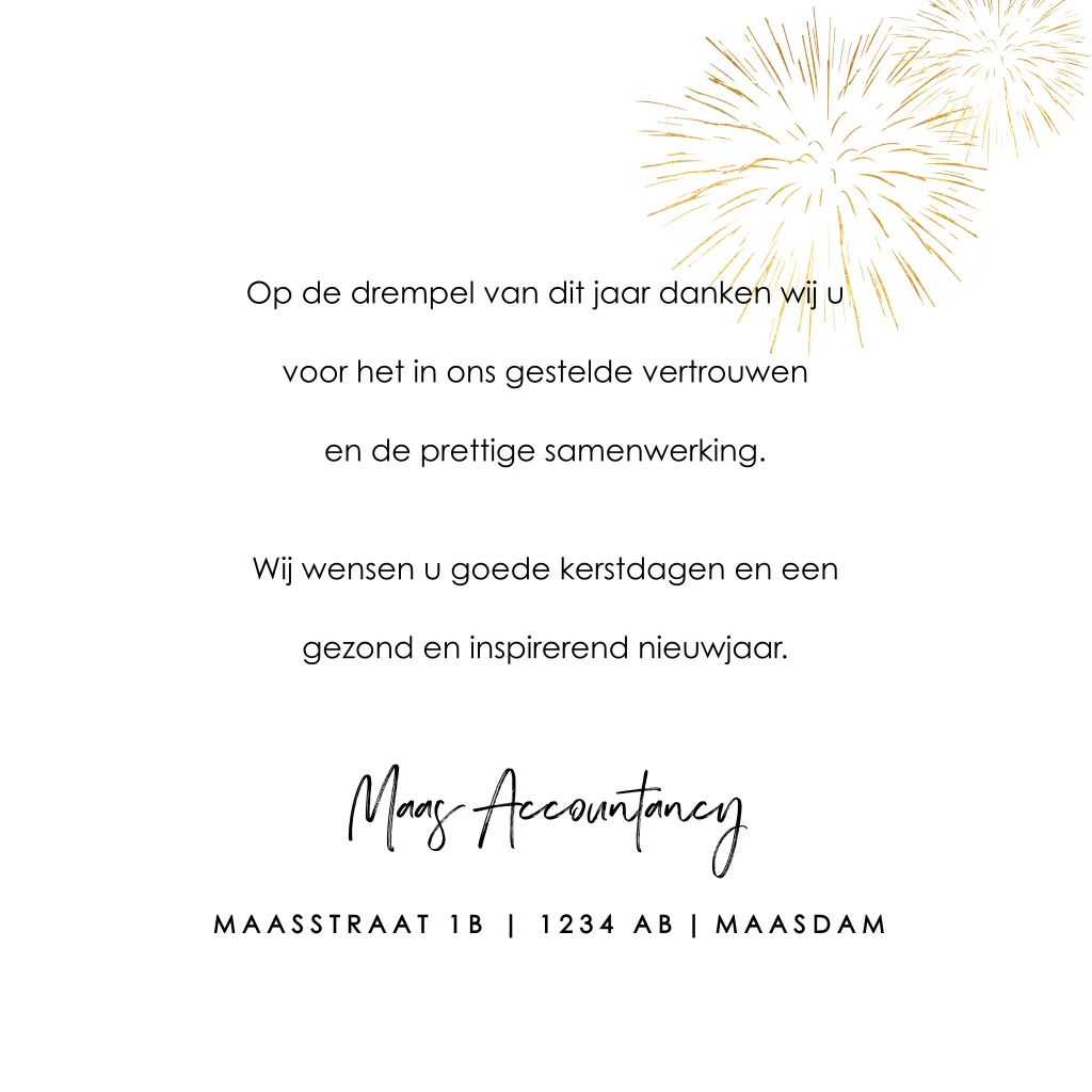 Stijlvolle kerstkaart met vuurwerk en spetters in goudlook. Je past deze kaart gemakkelijk aan in onze editor.