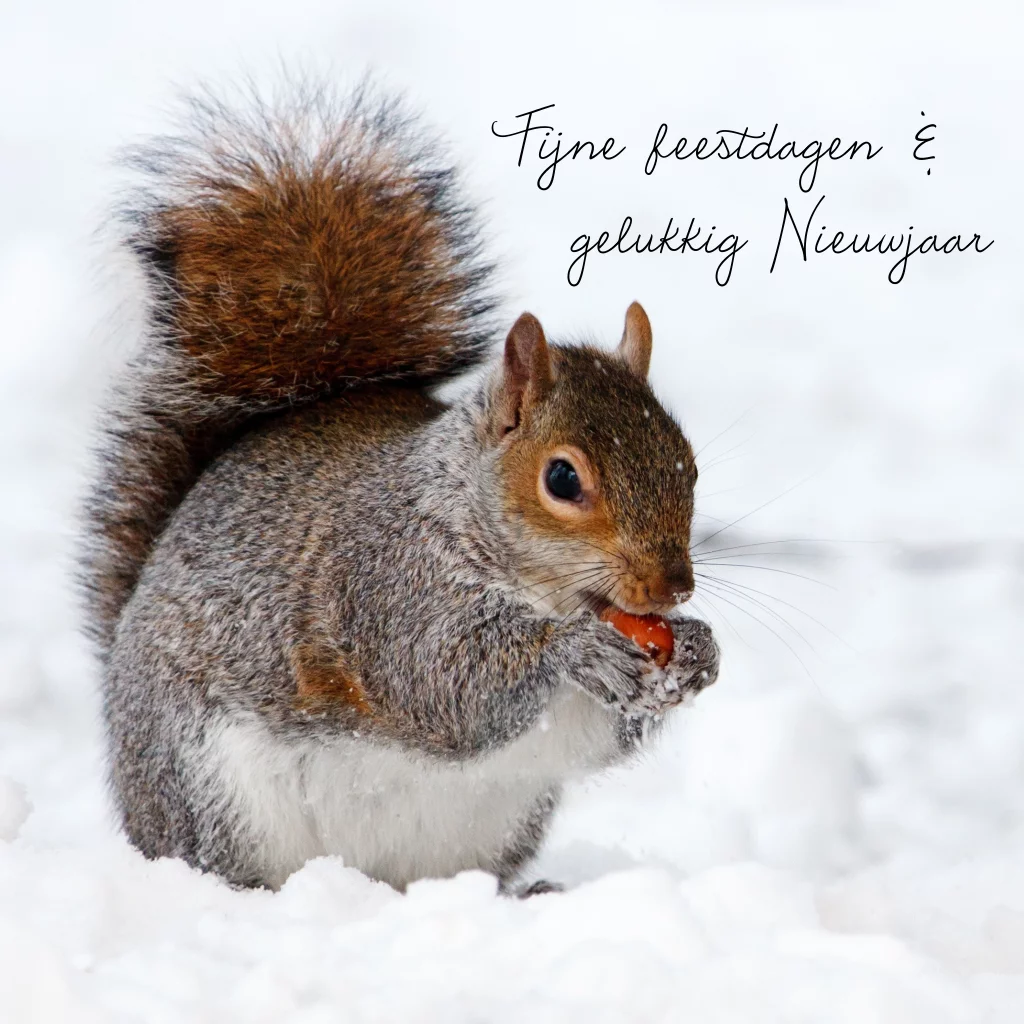 Winter kerstkaart met eekhoorn in de sneeuw. Verstuur deze klassieke kerstkaart naar je familie of bedrijf.